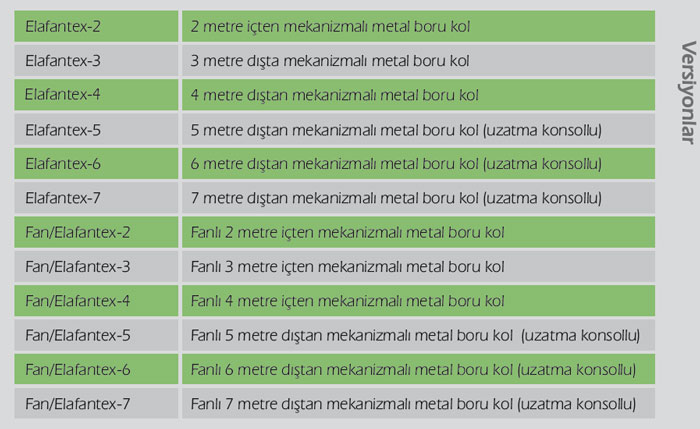 Dıştan mekanizmalı kollar standart olarak 2 - 7 metre uzunluğa kadar üretilmektedir. 4 metre ve üzeri uzunluklarda uzatma konsolu kullanılmaktadır. 7 metreden uzun kollar özel üretim olarak yapılmaktadır.