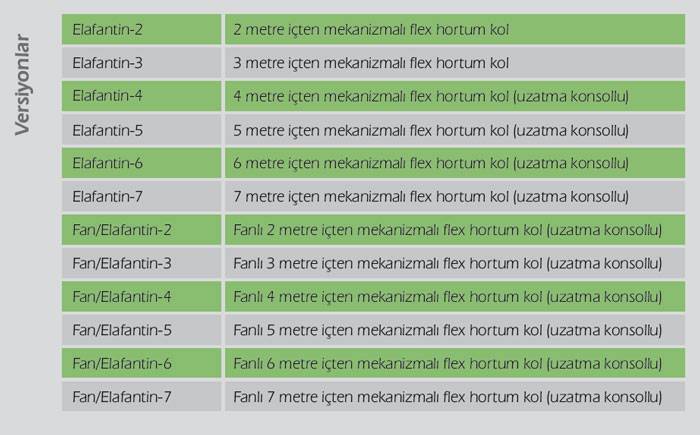 Standart olarak 150 mm çapında üretilen içten mekanizmalı emiş kolları, 360 derece dönebilir ve yay dengeli destek mekanizması ile sürtünme freni sayesinde istenilen yükseklikte ilave destek gerektirmeden durabilir.