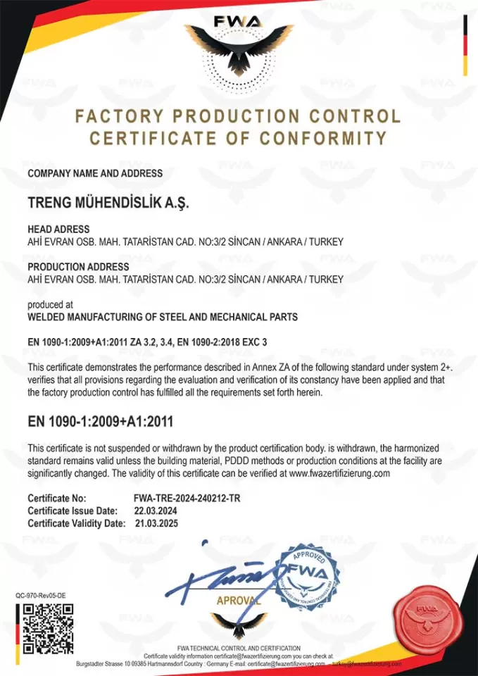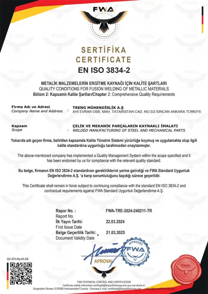 TRENG Mühendislik, müşteri memnuniyetini en üst seviyede tutarak, kaliteli ve güvenli ürün çözümleri üretmeye, süreçlerini sürekli iyileştirmeye ve takım ruhu içinde lider bir şirket olmaya devam edecektir.