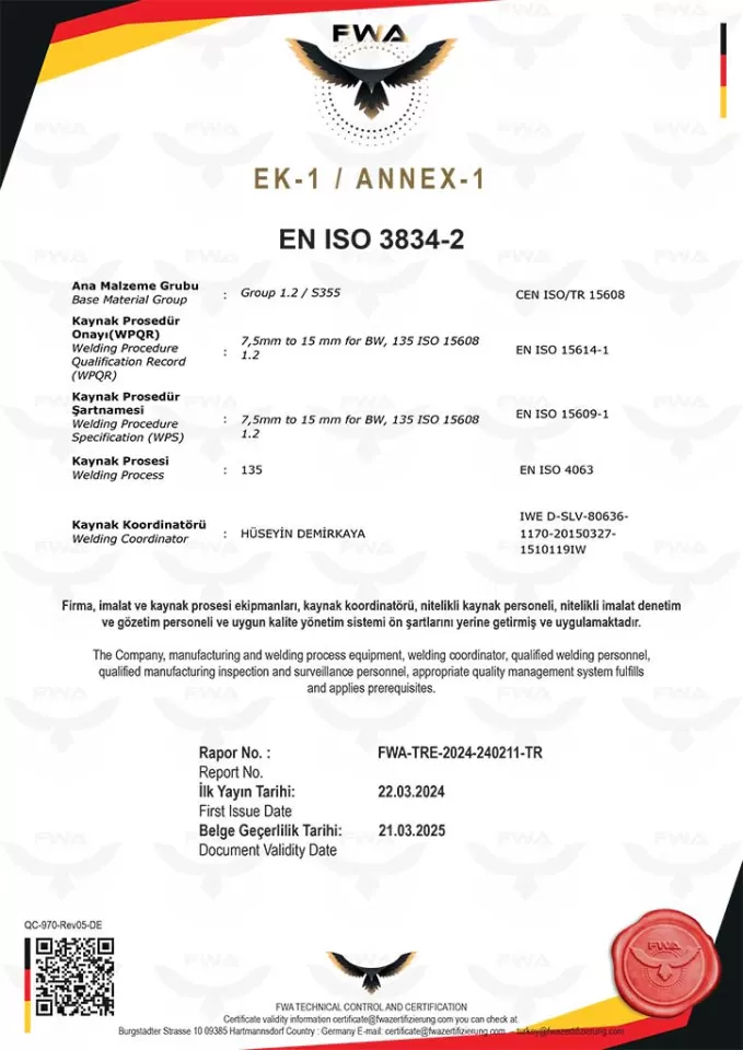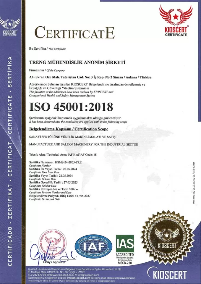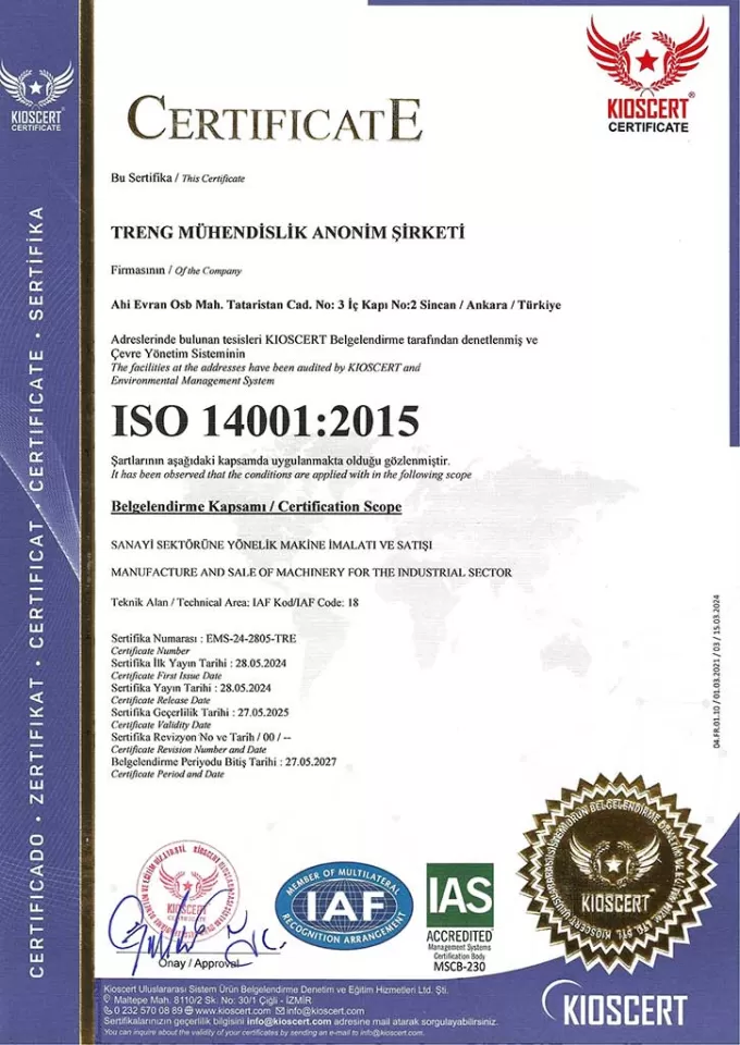 Kalite Yönetim Sistemi’nin şartlarına uymak ve etkinliğini sürekli iyileştirmek temel prensiplerimizdendir. Bu çerçevede, TS EN ISO 9001:2015, TS EN ISO 14001:2015 ve ISO 45001:2018 belgelerine sahibiz. Bu belgeler, kalite standartlarımızı ve müşteri memnuniyeti odaklı çalışmalarımızı uluslararası düzeyde tescillemektedir.