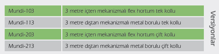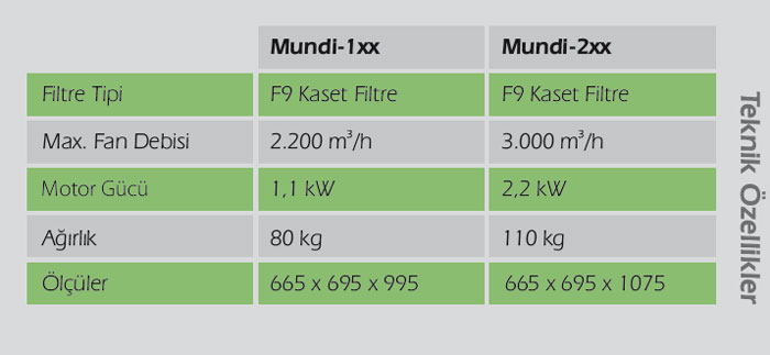 MUNDI mobil kaynak dumanı emme ünitesi, akrobat emiş koluyla dumanı kaynağından emerek filtreleyen kompakt bir emme ve filtreleme sistemidir. Tek kollu (Mundi-103) ve çift kollu (Mundi-203) olmak üzere iki farklı tipi bulunmaktadır. Hafif ve kompakt yapısı ile tekerlekleri sayesinde üretim alanlarında kolayca taşınabilir. Farklı bölgelerde kaynak işlemi yapılan atölyeler için idealdir. Emilen hava, kollar aracılığıyla %99 oranında duman ve partiküllerden arındırılarak ortama geri verilir. Kaynak dumanı filtre sınıfı W3'e sahiptir ve yüksek alaşımlı çeliklerin kaynağı sırasında güvenlik gereksinimlerini karşılar.