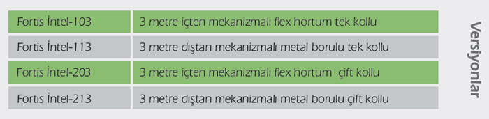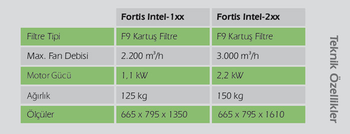FORTIS INTEL, mobil kaynak dumanı emme ünitesi farklı bölgelerde kaynak yapılan imalathanelerde, üzerinde bulunan akrobat emiş kolu ile direk kaynağından, dumanı emerek filtre edip tekrar ortama veren mobil filtre ünitesidir. İri tozları ve kıvılcımlı partikülleri tutan metal ön filtre ve fark basınç sensörü sayesinde kendini otomatik olarak temizleyen ikinci kademe kartuş toz filtresi mevcuttur. Tek kollu (Fortis Intel-103) ve çift kollu (Fortis Intel- 203) tipleri mevcuttur.